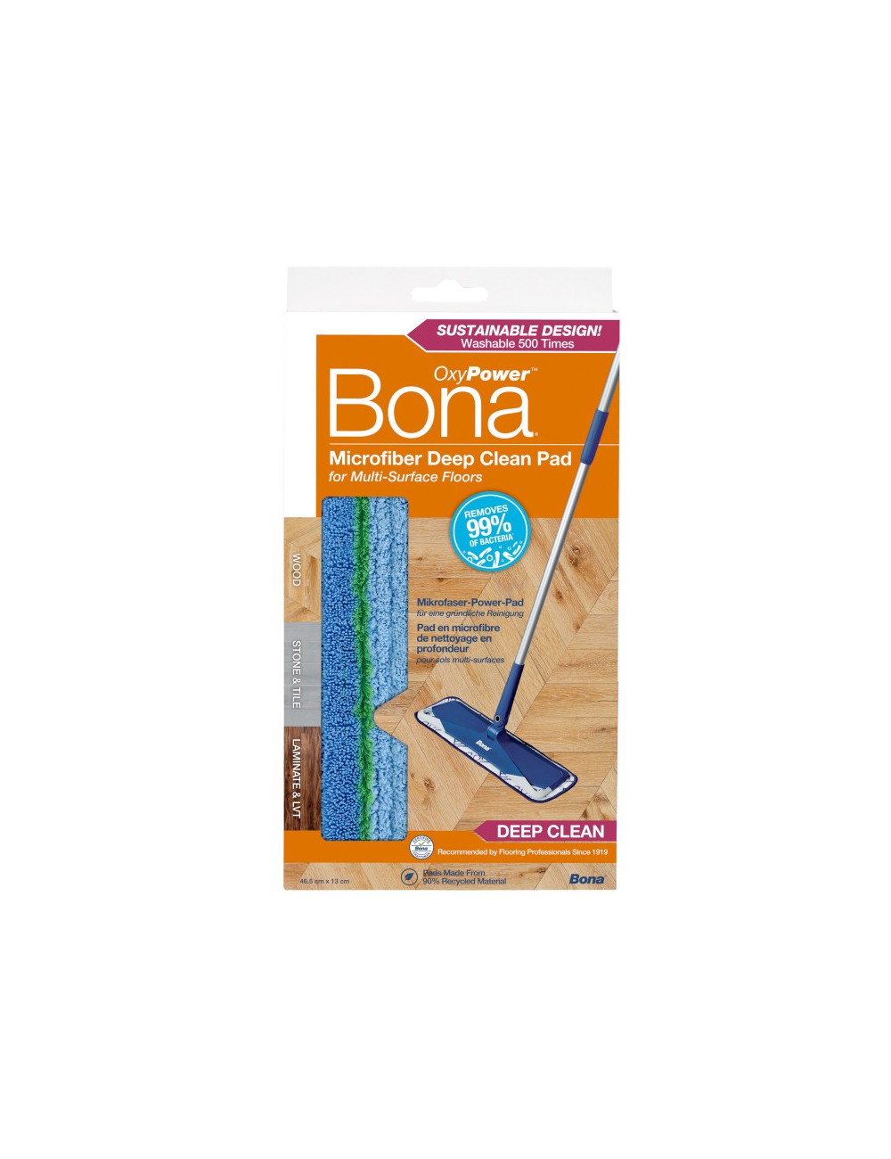 El Recambio Mopa Limpieza Profunda de Microfibra Bona con tecnología PowerLoop® levanta y elimina grandes acumulaciones de suciedad. Para obtener los mejores resultados, usar el Limpiador Profundo de Suelos de Madera Bona y el Limpiador Profundo para Suelos Laminados y Superficies Duras Bona de la gama Bona Pet.