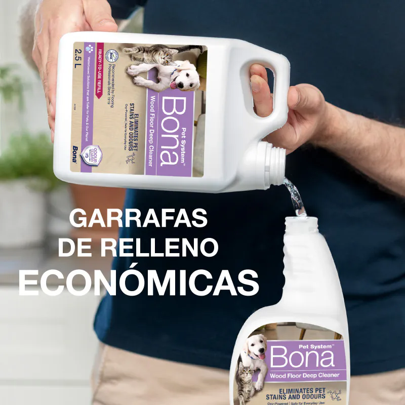 El Recambio Limpiador para Limpieza Profunda de los Suelos de Madera Bona Pet System™ ofrece una solución oxigenada que limpia en profundidad y penetra en las manchas difíciles incrustadas, en la suciedad de las mascotas y neutraliza los olores de los accidentes.