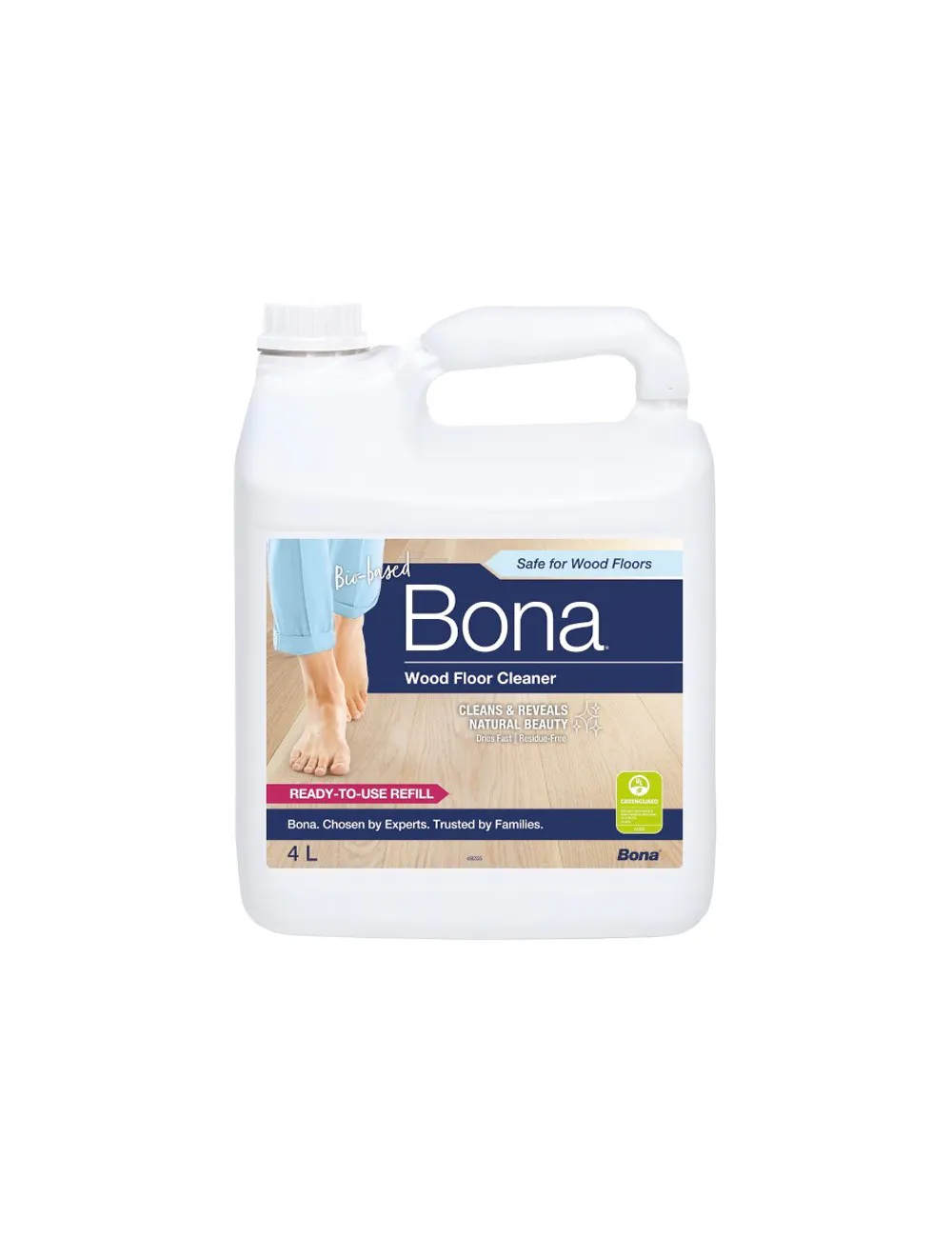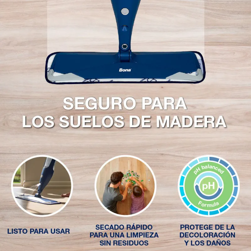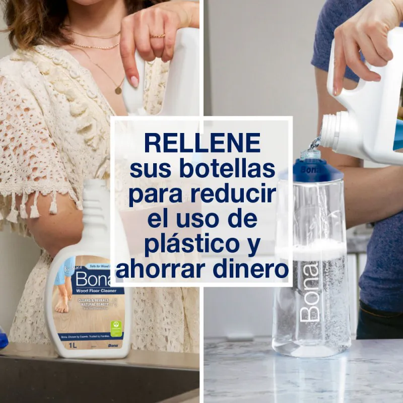 El Limpiador de Suelos de Madera Bona en formato económico puede utilizarse para recargar tanto la botella recargable de la Bona Spray Mop Premium como el cartucho de limpiador de la Bona Spray Mop antigua y el limpiador en formato spray de Bona de 1L. Está específicamente diseñado para eliminar polvo, tierra y suciedad de los suelos de madera con total seguridad. Su fórmula lista para usar se seca rápidamente y no deja residuos.