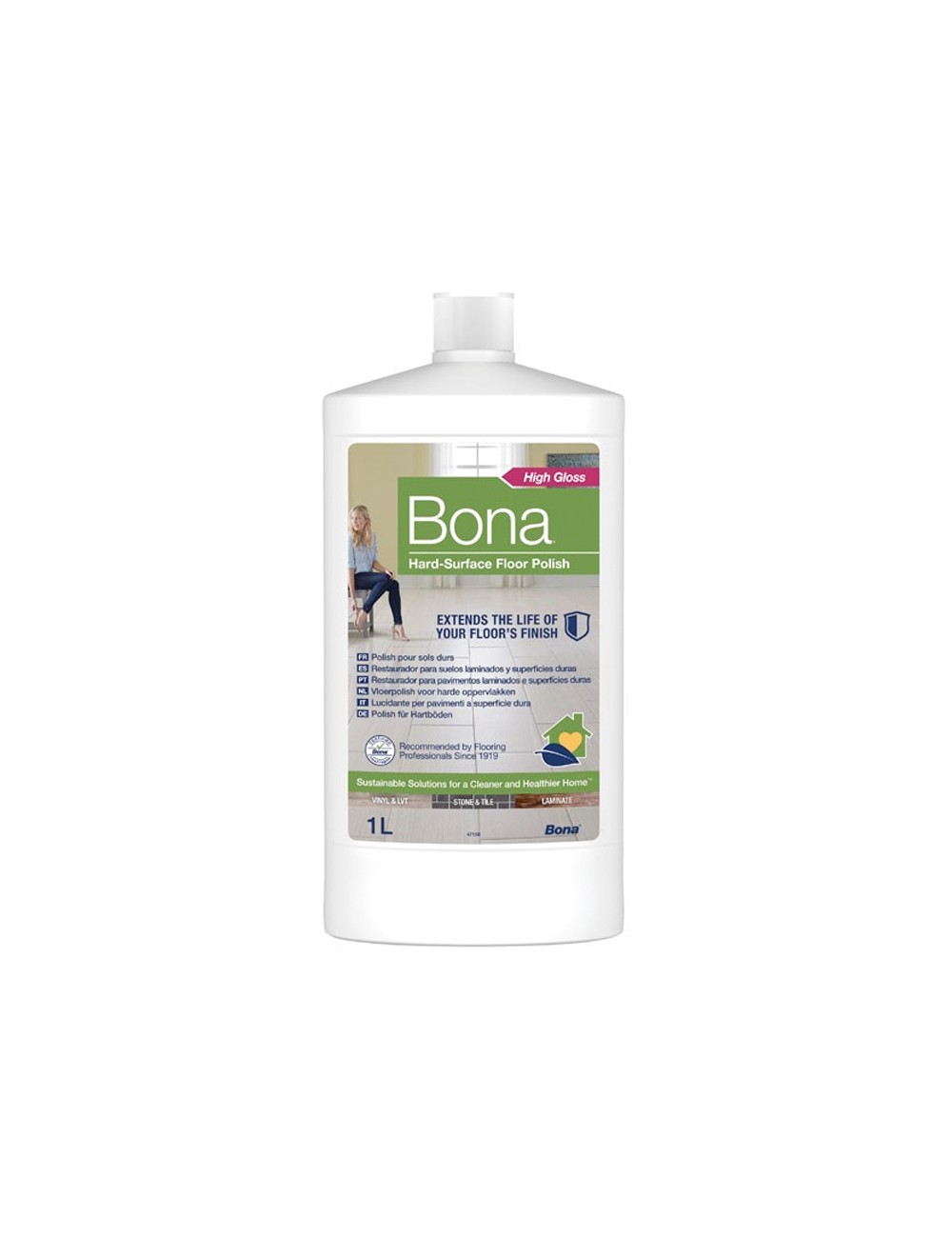 Restaurador de Pavimentos Laminados e Cerâmica Bona 1 L é uma protecção de manutenção brilhante pronta a utilizar para grande parte dos pavimentos de superfícies duras, pavimento flutuante laminado, vinil, linóleo, cerâmica não vidrada (cerâmica, pedra) pedra e mármore selado.