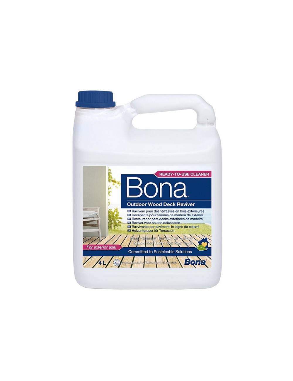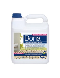 Renascimento da Madeira Bona 4 L para Limpeza de deck de madeira exterior está formulado para uma limpeza profunda de deck madeira, especialmente madeira de coníferas, pinheiro-larício, abeto e pinho, limpa em profundidade a madeira suja e com óleo antigo.