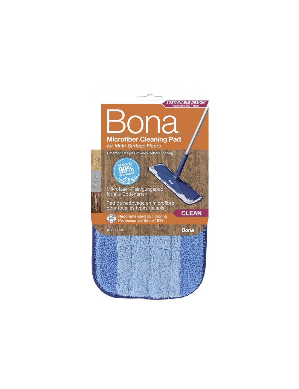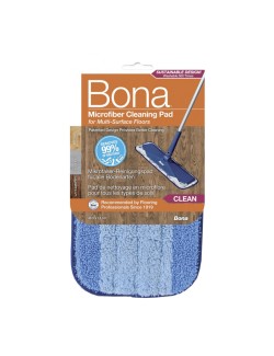 Pad Mopa Limpador Bona para limpeza de pavimentos é um pano de microfibra lavável, que adere com fitas de velcro a todas as Mopas da Bona, incluíndo a Mopa Spray da Bona, excelente para limpeza de soalho envernizado, oleados, parquet, pavimento flutuante laminado, vinil e cerâmica (superfícies duras).
